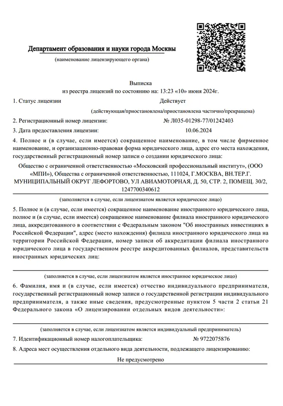 ООО «Московский профессиональный институт» 111024, г. Москва, ул. Авиамоторная, д. 50, стр. 2, помещ. 30/2